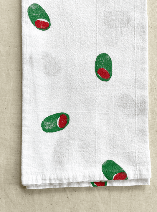 Olive Block Print Tea Towel