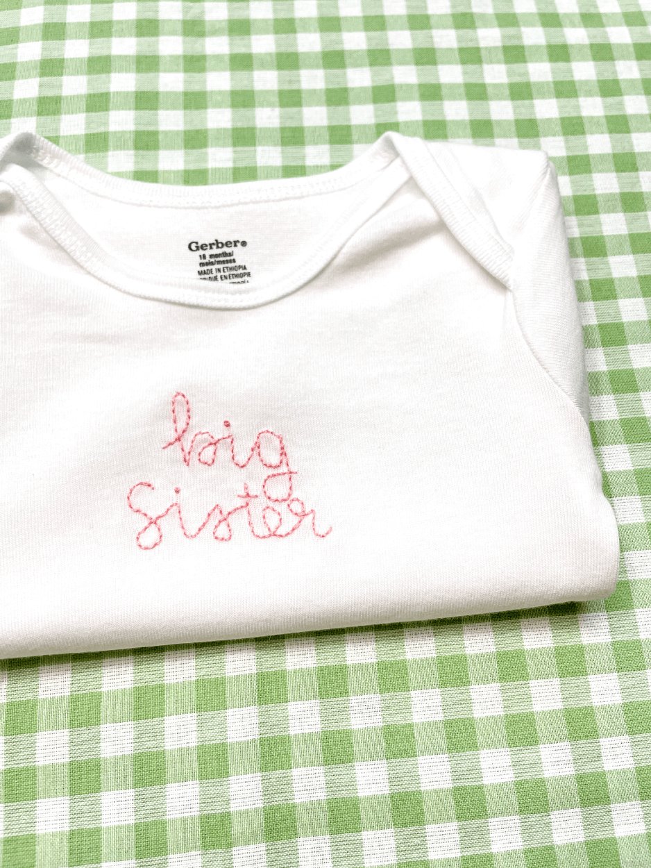 The perfect outfit to help the little one step into their new role as the older sibling! Featuring "Big Sister" hand embroidered in pink on the center chest, this outfit is a sweet way to help celebrate the growing family!