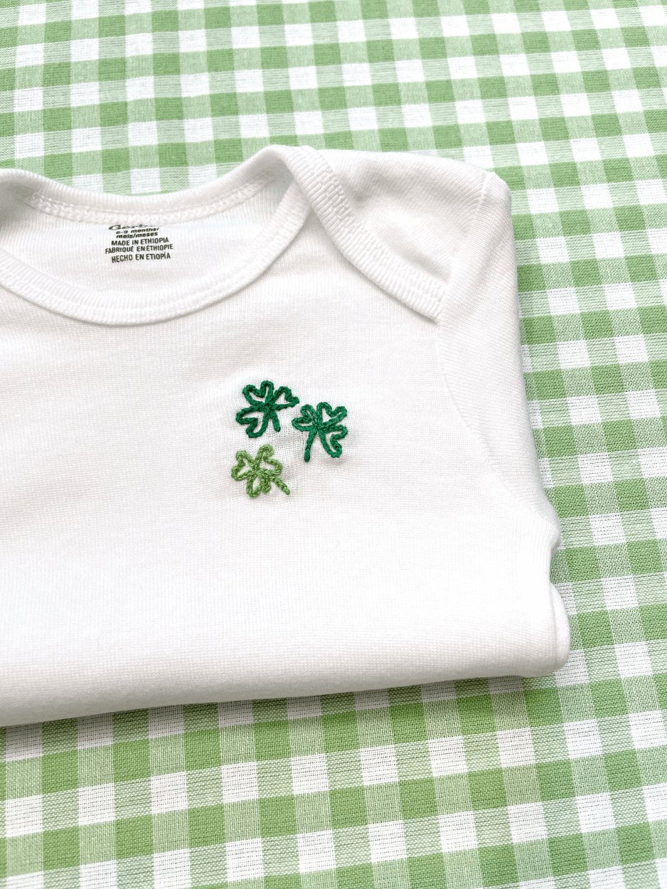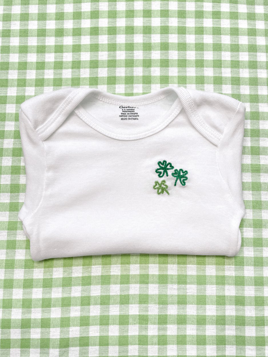 Bring a little extra luck to your baby’s wardrobe with this sweet bodysuit! Featuring three hand-embroidered clovers on the left chest, it’s perfect for St. Patrick’s Day or adding a whimsical touch to everyday outfits.