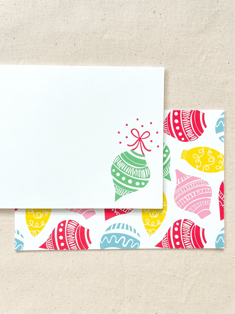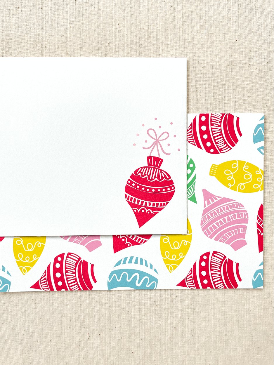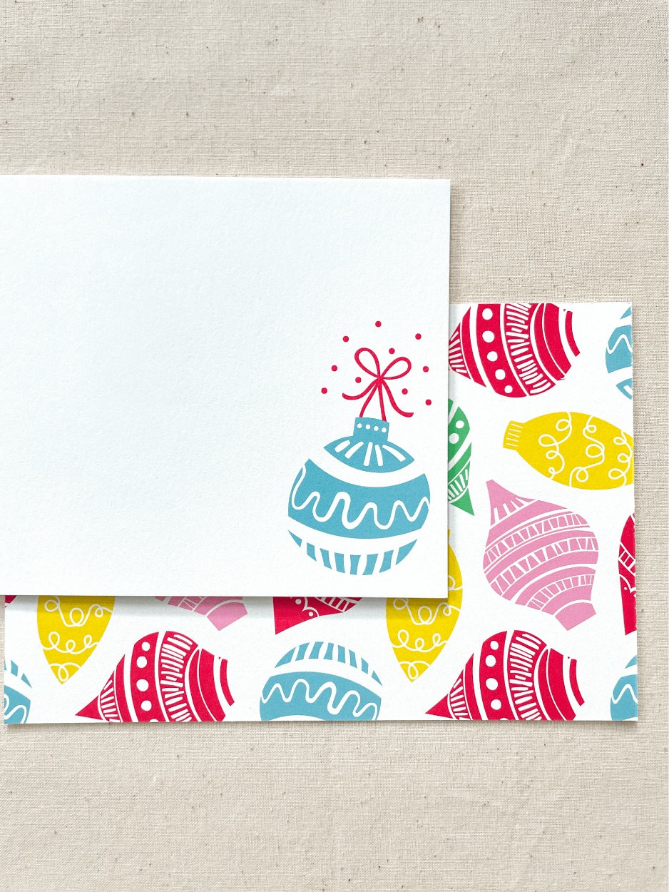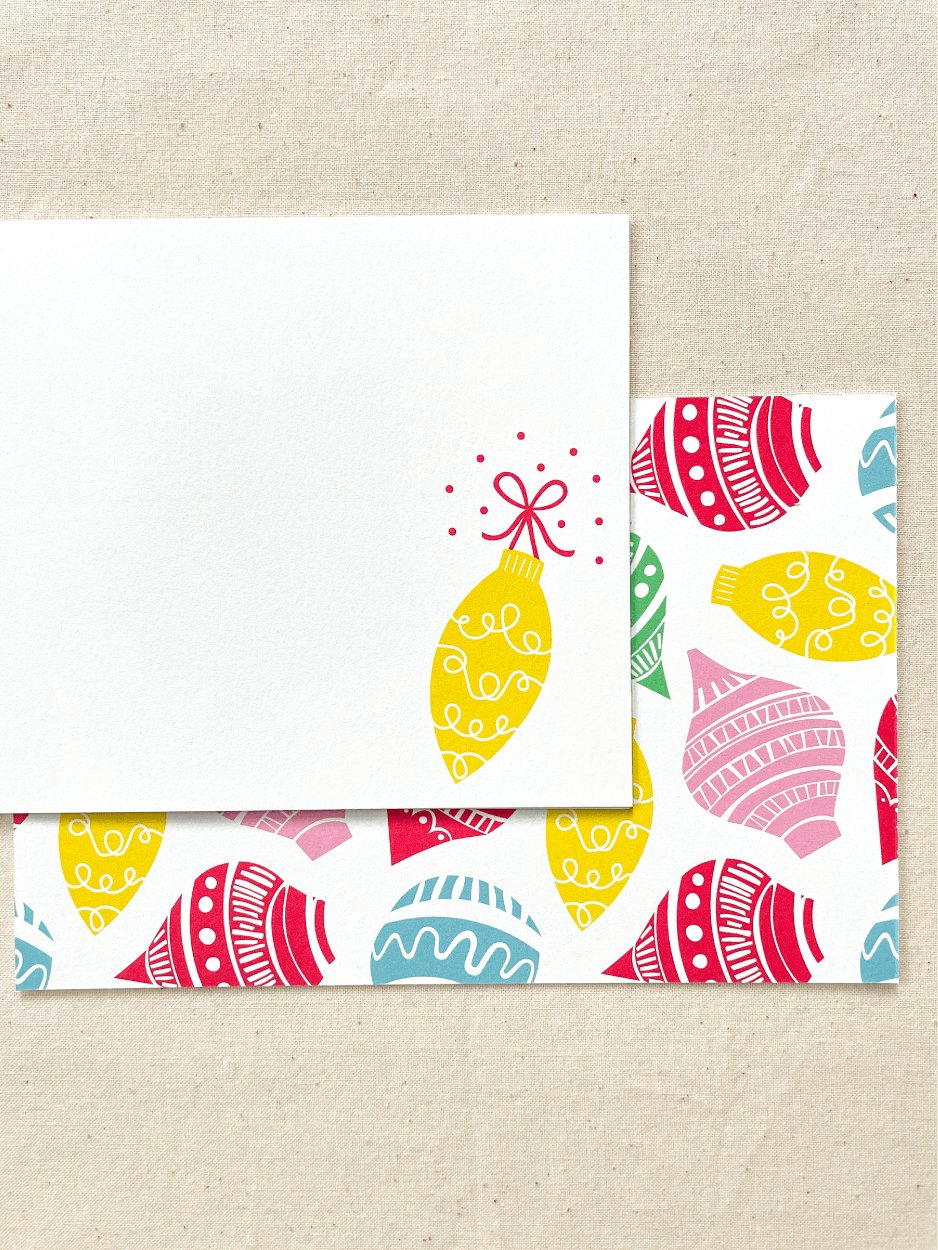 Each card features a block print-inspired ornament in the bottom-right corner on the front and a vibrant, colorful ornament pattern on the back. These cards are perfect for writing holiday notes, recipe sharing, or as a thoughtful hostess gift.