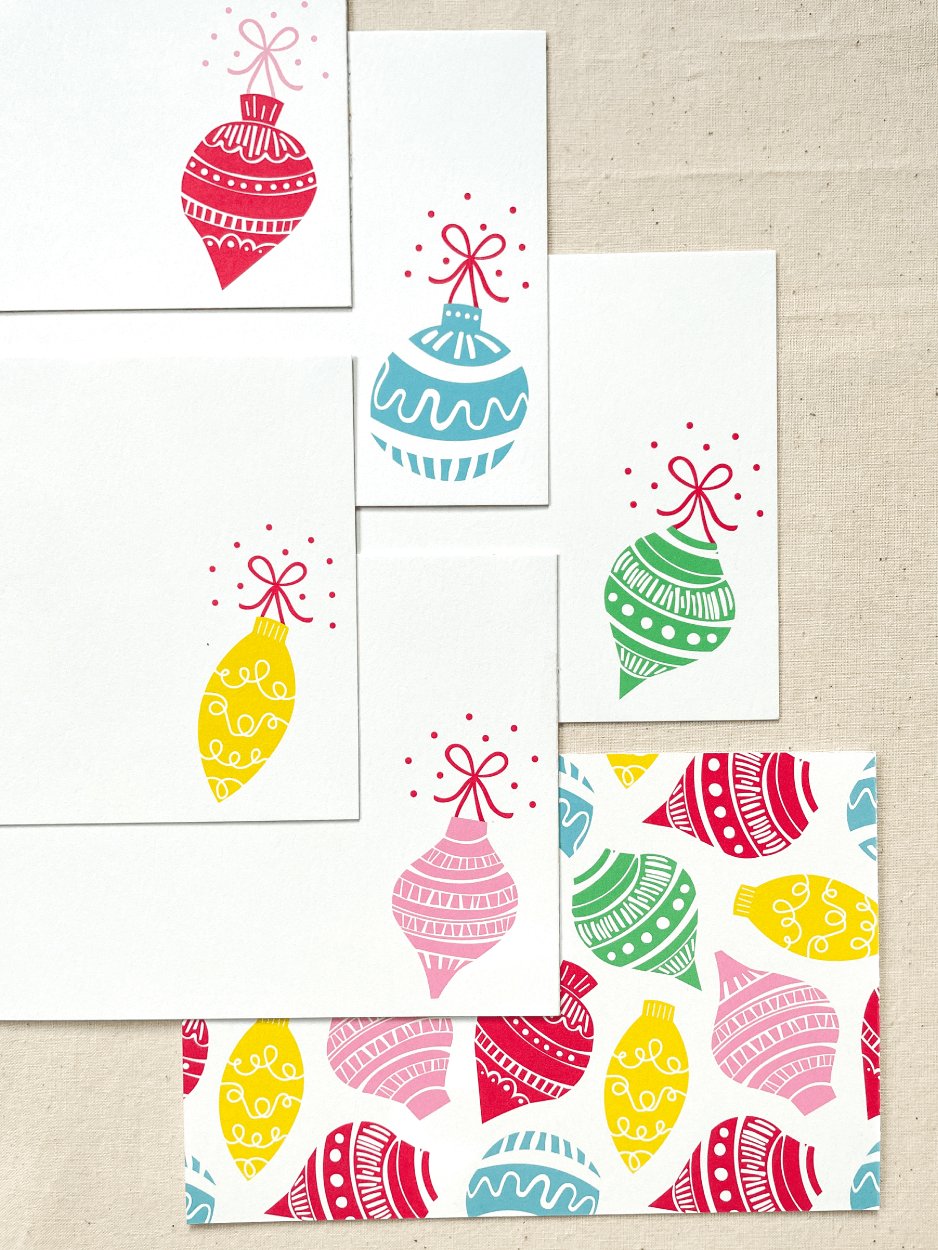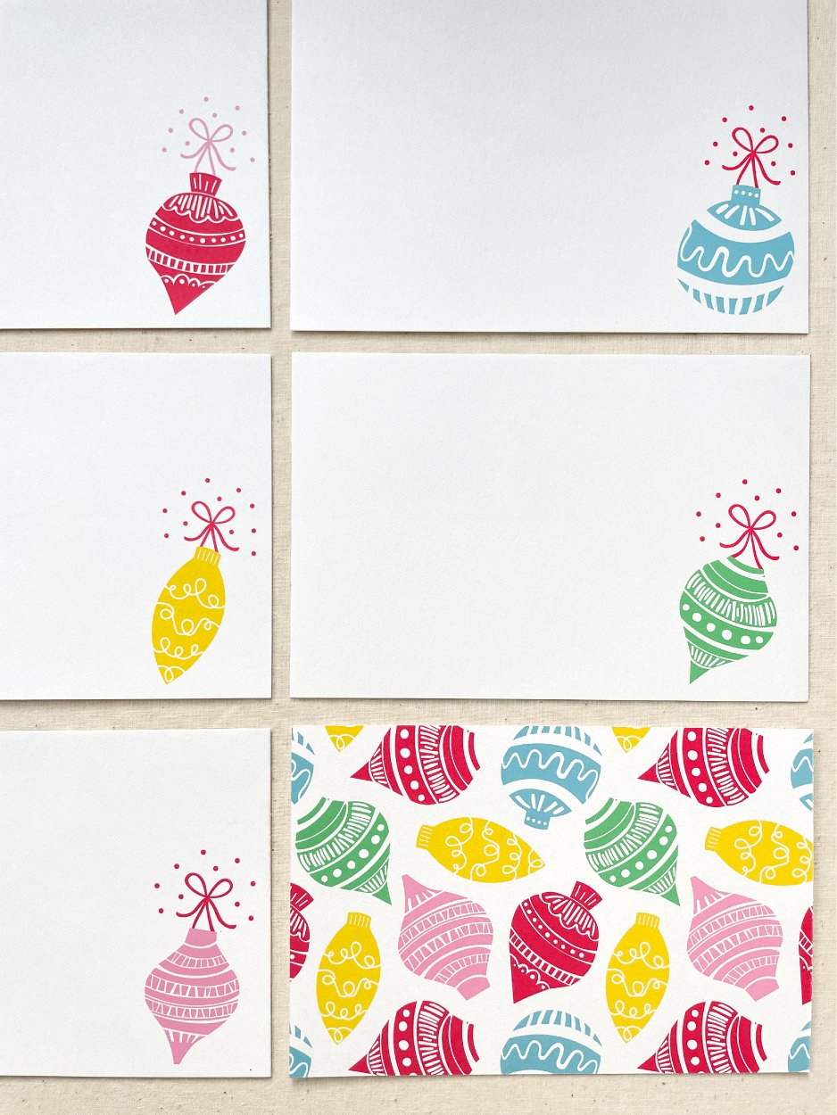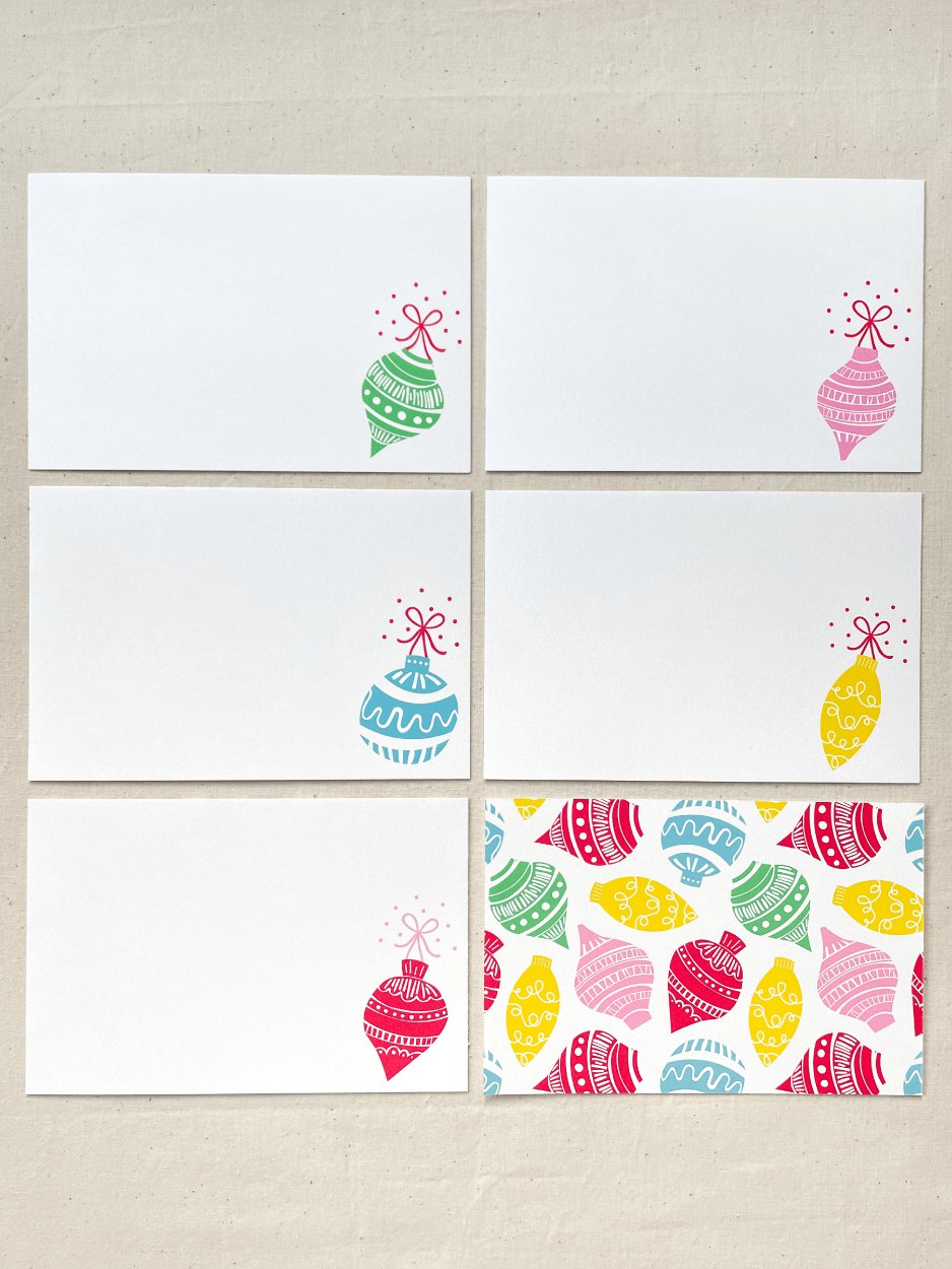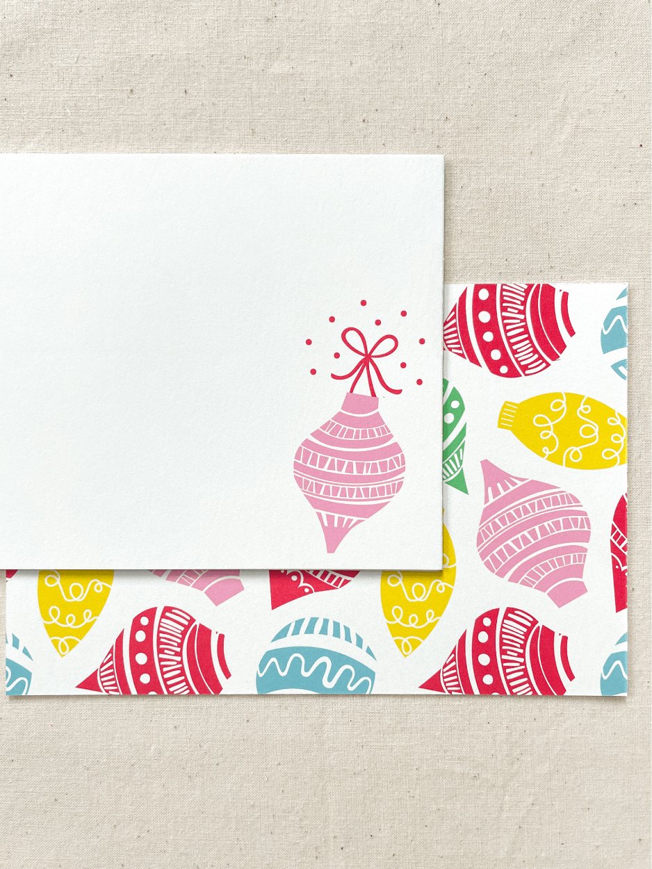 Each card features a block print-inspired ornament in the bottom-right corner on the front and a vibrant, colorful ornament pattern on the back. These cards are perfect for writing holiday notes, recipe sharing, or as a thoughtful hostess gift.