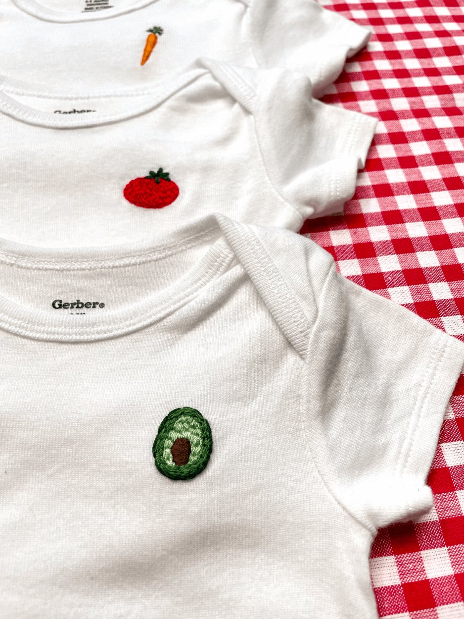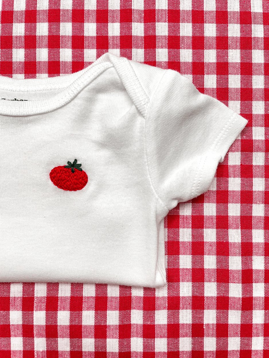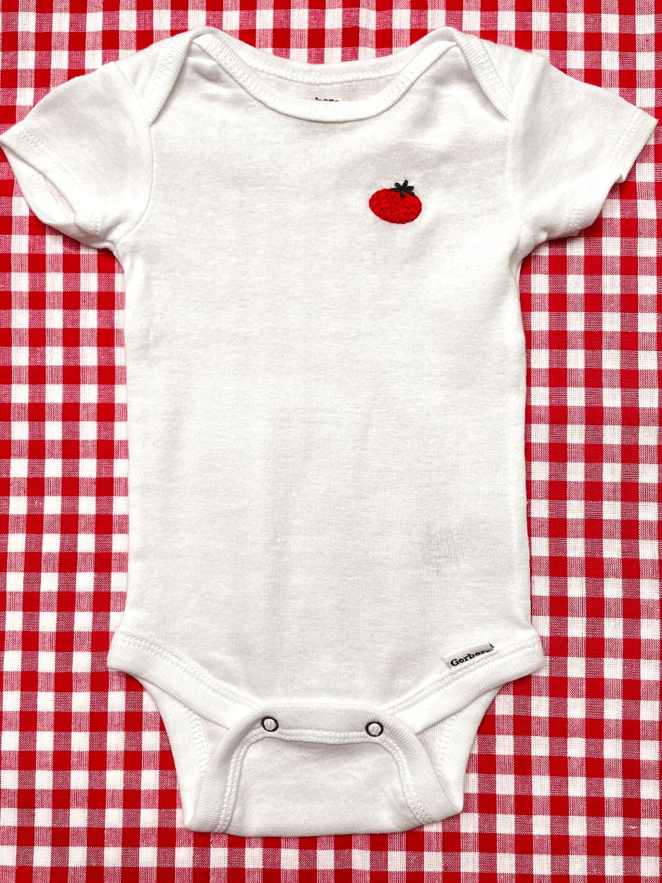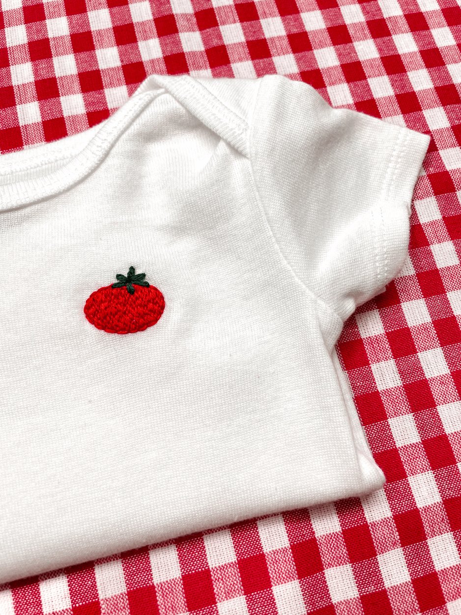 Have your little one looking simply adorable in this fun and playful bodysuit featuring a hand-embroidered tomato on the left chest.